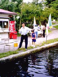 一面のぶどう棚から、ぶら下がった ぶどうをお腹いっぱい食べて 「大満足・・」と思ったら「エーッ」とびっくり。 バーベキューにレインボーフライ (ニジマスのフライ)、お刺身と 「こんなに食べていいのかなぁ?」。 でも「今日ぐらいはスカートのウエストのことは 忘れてやっぱり食べちゃおう! いっただきまーす」。 |