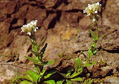 エゾノイワハタザオ (アブラナ科) 花弁の長さ約10mm、果実の長さは7〜8cmで 開出、岩の上にはえる多年草。高さ30〜40cm、 白い十字状花をつける。 北海道・本州北部に分布する。 日本名蝦夷岩旗竿。