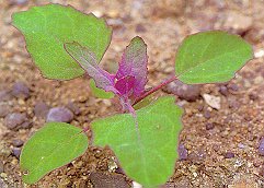 アカザ (アカザ科) アカザ属は世界に約30種分布、日本には 5種あり、昔は若葉を食べるに畑に栽培された。 今ではかえり見られず畑の周りに野性化。 全形シロザに似るが、中心部が紅紫色の 粉状毛におおわれ美しい。 インドの原産といわれる。 茎は軽くて「アカザの杖」と呼んで、老人に 使われる。