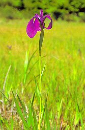 ノハナショウブ (アヤメ科) 湿った草地にはえる多年草。直立した 葉身には、にせの中央線(中肋)があって 両面につき出し、はっきりしている。 花は紫紅色で、外花被(がくにあたる部分)の 基部に細い黄色部がある。 花柱裂片の先の付属体はまるい。 日本名は野花菖蒲。