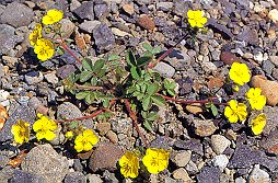 キジムシロ (バラ科) 日あたりのよい山地、路傍にはえる多年草。 全株に粗毛があって、走出枝を出さない。 春、地面をはうように開いた花茎に、花を 10個内外つけ、目だつ存在である。葉は 花が終ると壮大になり、別種と誤って オオバツチグリと呼ばれるほどになり、 日本名を雉蓆と呼ばせたのはこの時期の ものと思われる。キジの坐るむしろに 名ぞらえたもの。