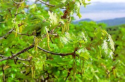 カシワ (ブナ科) 海岸から山地の日あたりのよいところにはえる 落葉木。枝には褐色の短毛と星状毛が密生、 葉のふちの切れこみの歯の先は波形で円い。 果実の総包(はかま)は杯状で、総包片は線状で 外側にそりかえる。 日本名は槲で、炊葉の意味。食物を盛る葉のこと。 昔は食物を盛る葉をすべてカシワと呼んだが、 今日では本種の固有名となった。