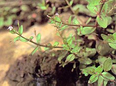 アゼナ (ゴマノハグサ科) 田のあぜや湿地に多い1年草。 茎は高さ10〜20cm、基部で分枝する。 葉は全縁できよ葉はない。 花は長い柄があって葉腋につく。 花冠は唇形で淡紅色をしている。 雄しべは4本ともやくがある。 日本名は畦菜で水田に多かったが、 農薬の使用で殆ど姿を消した草本の1つである。