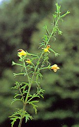 ヒキヨモギ (ゴマノハグサ科) 日あたりのよい草地にはえる半寄生の1年草。 茎は高さ30〜60cm、細毛を密生、 葉は羽状に深く裂ける。 花は長いがく筒をもち、花冠は鮮黄色、 長さ20mmほど、上下の2唇にわかれ、雄しべ、 雌しべは上唇に包まれる。下唇は3裂、 上面に大きな2つのひだがある。