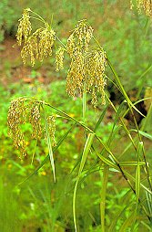 アブラガヤ (カヤツリグサ科) 湿地にはえる大きな多年草。 茎は株立ちで高さ70〜150cm、切り口は 鈍い三角形でかたい。花序は茎頂や 横枝にもつき、多くの褐色の小穂をつける。 日本名は油ガヤで、花穂が油色をおび、 かつ油臭いのにもとづく。