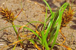 コウボウムギ (カヤツリグサ科) 海辺の砂地にはえる大形のスゲ。根茎は 長くのびてはいまわり、所々地上茎を 砂上に出す。茎は切り口が三角形で、 じょうぶで切れにくく、表面はつやがあり、 へりにはとげのような歯がならんでざらつく。 雌雄異株。日本名弘法麦。
