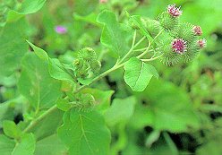 ゴボウ (キク科) 栽培種であるがときに路傍原野に野生化する2年草。 根は太くて真直にのびる。葉には長い柄があって、 長い心形、表には綿毛が多い。 頭花は球形で、花はすべて筒状花である。 総包片は針状で先が鉤になっていて、 果実になるとものにひっつきやすい。 「ダコビ」と呼んで子供の頃投げ合って遊んだ。