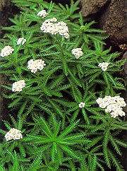 ノコギリソウ (キク科) 山地の草原に普通にはえる多年草で、 地下茎をのばしてふえる。茎はそう生し、 高さ50〜100cm、葉は長さ6〜10cm、 幅7〜15mm、裂片は茎を抱く。 くしの葉状に中裂〜深裂し、裂片には 鋭きょ歯がある。舌状花は5〜7個で白色、 花冠の長さ3.5〜4.5mmである。