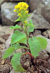オオアキノキリンソウ (キク科) 主に海岸にはえる多年草。茎は太く高さ約60〜80cm、 茎の下部の葉は広卵形で大きく、大きいもので長さ 約10〜15cm、幅7cmで、頭花は径1・2mmで 多数密集し、周りに舌状花、中心に筒状花がある。 果実は3mmほどで上部に毛がある。