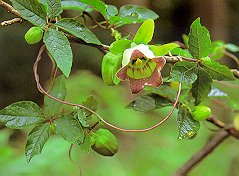 ツルニンジン (キキョウ科) 山の日かげにはえるつる性の多年草。 切り口から白い乳液が出る。葉は互生であるが 枝先ではつまって4枚輪生のように見える。 がくは深く5裂して青白く、花冠は袋状で先だけ 浅く5裂、裂片は外側につよくそり返る。 外面は白緑色、内面は紫かっ色のはん点がある。 別名ジイソブで、ジイは老爺、ソブは方言の そばかすで、老爺のそばかすのある顔にたとえ、 別種バアソブ(老婆のそばかすのある顔)に 対したもの。