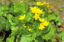 エゾノリュウキンカ (キンポウゲ科) 学名パルストリスとは「沼地を好む」で、湿地に はえる多年草。 高さ50〜80cm、茎は大きな株になる。 太いが軟らかい葉は腎形で大きく、幅15〜30cm、 つやがあり、ふちには荒い3角状の規則的な のこぎり歯がある。 花は径3.5〜4.5cm、4〜8個つける。 花柄は果時には長さ6〜12cmになる。 日本名蝦夷立金花は、茎が直立して金色の 花をつけ、蝦夷(北海道)にはえるという意味。