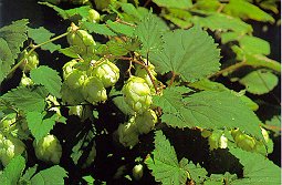 カラハナソウ (クワ科) つる性の多年草。 雌雄異株。雄花は房状につき、雌花はまり状につく。 果時、包葉は重なって松かさ状に集まって垂下する。 果実と包葉には腺点があり、芳香を出すので 「野生のホップ」と呼んでいる。ビールに使うのは 「セイヨウカラハナソウ」で、腺点が多く苦味が強い。 (写真は雌花)