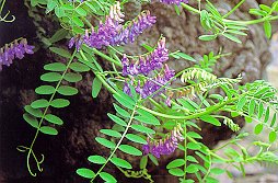 ヒロハクサフジ (マメ科) クサフジに似るが、別名ハマクサフジ (浜草藤)と呼ばれるように海岸に多い。 小葉は5〜8対と少なく(クサフジ9〜12対)、 長だ円形で幅6〜10mm(クサフジ2〜7mm) で広く、軟毛があり淡緑色、花は大きく 約15mm(クサフジ約10mm)、がく片は 3角形などで明らかに区別される。 日本名は広葉草藤。