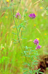 ムラサキウマゴヤシ (マメ科) 地中海沿岸原産の帰化植物。アルファルファ またはルーサンの名で牧草として賞用されたが 利用されなくなり、他の牧草に変わられ路傍に 野生化した。茎は枝が多く出て高さ30〜90cm、 花は淡紫色、豆果はらせん状に巻く。 日本名は紫馬肥しで、肥料として使用されるの 意味。