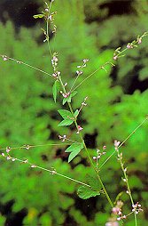 ヤブハギ (マメ科) 山林内にはえる多年草。葉や花の形は ヌスビトハギによく似ているが、茎はほとんど 枝分かれせず、葉は中部以下に密集して つき、葉質はうすく、小葉は幅広く大形で、 下面は淡色などの点で区別される。 日本名薮萩。