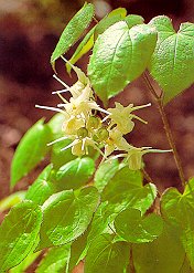キバナイカリソウ (メギ科) 林内にはえる多年草。 茎の高さ40cm、イカリソウに似ているが淡黄色で 大きく、花弁は、長さ8mm、がく片は8枚あるが 外側の4枚は早く落ちる。 距は2cm以上となり、4本あっていかり状となる。 雄しべ4本は花弁の基部につく。葉は3出複葉で、 小葉は大きく、先はとがる。 日本名は黄花錨草、別名サンシクヨウソウ (三枝九葉草)は、3本の柄にそれぞれ1枚の 葉がつくので、合わせて9枚になるから。