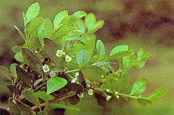 ハイイヌツゲ (モチノキ科) 山地や湿地にはえる常緑の低木。下方ははい 立上がりは1mぐらいである。葉は厚く裏面に 腺点が散在する。新しい枝の葉のつけ根に 花を咲かせる。果実は球形、熟すと黒くなる。 雌雄異株。