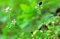 ナンバンハコベ (ナデシコ科) 林のへりなどにはえる多年草。茎は細くて つる状にのび、多くの枝を出して木に からまる。葉は対生、花はふくらんだがく、 花弁5、雄しべ10、雌しべ1よりなり、 花弁は白色、途中で急に外側に曲がり、 深く2裂する。果実は球形、熟すと黒くなる。 なでしこ科でつるになるのはこの種だけ。 日本名南蛮ハコベは、南蛮渡来の意味ではなく、 花の形が異風と見てつけた。
