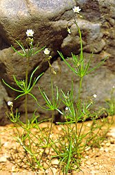 ノハラツメクサ (ナデシコ科) 欧州原産の帰化植物。1〜2年草。 高さ20〜50cm。葉のつき方に特徴があって、 各節に10〜20個輪生、糸状、やや多肉質で 長さ1.5〜4cm、幅1mm。托葉は長さ1mm、 白質膜、花序は茎頂、葉腋につき、まばらで 小さな白花をつける。