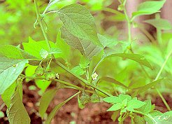 イガホオズキ (ナス科) 山地の木かげにはえる多年草。 茎の高さ60cmくらい、葉腋に2〜3個の花柄の ある花を下向きに開く。花冠は短い鐘形で 淡黄色、がくははじめ小形の盃状であるが 花が終ると大きくなり、緑色で果実を包み、 外面にはとげ状の突起がある。 日本名は毬栗(イガグリ)に外形が似て いるからつけたものである。