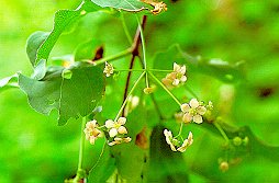 ツリバナ (ニシキギ科) 山地にはえる落葉低木。葉腋に長い柄のある 花序(花の集まり)を出す。花は淡緑色で やや紫色をおびる。果実は球形で、赤熟すると 5裂して朱赤色の仮種皮に包まれた赤い種子を ぶらさげる。日本名は吊花で、花や果実が さがっていることに基づく。この果実でアタマジラミの 駆除をしたという(戦中DDTのない以前の話)。