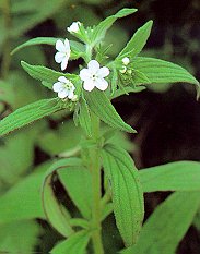 ムラサキ (ムラサキ科) 草原にはえる多年草で白色の粗毛がある。 根は乾くと紫色(紫根)になる。茎は高さ50cm、 上部で分枝する。葉はぼったりして2〜3の側脈が はっきりしている。花は白色で上部の葉(包葉)の もとにつく。 日本名は紫で紫染料から出た名である。 万葉集には17首詠われているが、登場する 植物の中で最も貴族的に扱われている。 ”つくまのにおふる紫きぬにして いまだ着ずしていろにいでにけり”