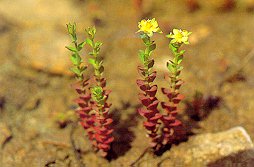 コケオトギリ (オトギリソウ科) 低地の田のあぜや休耕田、湿地にはえる小さな1年草。 茎の高さ5〜20cm、よく分枝する。葉には明点があり、 質はうすい。秋には紅葉する。その頃、葉のつけ根に 肉芽ができ、株が枯れても肉芽が地表にあって春 新苗となる。 日本名苔弟切は、コケのように小さいという意味。