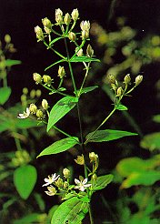 アケボノソウ (リンドウ科) 山野の湿地にはえる1〜2年草。 茎は高さ60〜90cm、枝が多い。 葉は対生して3脈が目だつ。花は白色、 花冠裂片には多くの黒点と2個の淡緑色の はん紋がある。この2個が蜜の貯蔵庫で、 蜜を分泌する。 日本名は曙草で、花の色があけ方の空を 彩り、特に花冠に散布する細点を暁の 星と見たてたもの。
