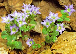 フデリンドウ (リンドウ科) 海岸からブナ林内、草地などに はえる小型の2年草。 茎は高さ5〜10cm、厚ぼったい小さな 葉を対生、下面がしばしば赤紫色に 染まることがある。根もとは大きな葉が ないのが、ハルリンドウ(本道に分布)、 コケリンドウ(本道分布なし)との 区別点である。 日本名は筆竜胆で、蕾の時期は筆に 似ているという。