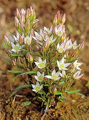センブリ (リンドウ科) 海岸の草地から山地の草原にまで はえる小さな1〜2年草。 茎は分枝しないか、または基部から数本 分かれ直立する。いっぱんに黒紫色になる。 晩秋、最後に開花する野草のようにも 思われる。 日本名は千振で、千回振っても苦味がある、 即ち、薬効が失せないという意味である。 古くから苦味健胃剤として使用されている。