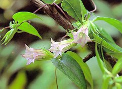 ツルリンドウ (リンドウ科) 山の木かげにはえる多年草のつる草。 葉は対生、茎は黒紫色でものに巻きつき、 基部は浅いハート形で、平行に走る 3〜5脈が目だつ。 花は、淡紫色、果実は液果のように赤く 裂けず、少数の大きな種子があるのは、 他のリンドウ属と変わるところである。
