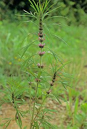 メハジキ (シソ科) 道端や荒れ地にはえる2年草。 茎は4角形で高さ60〜100cm、白い短毛を密生、 中・上部の葉はほとんど手のひら状に裂けて 細い裂片となる。花冠は淡紅色、長さ10〜13mm、 がくは6〜7mm。 日本名目はじきは、子供達が茎を短く切って、 まぶたにはさんで目はじきあそびをしたことによる。 別名ヤクモソウは、益母草で漢方ではこれを 乾燥したものを産前産後に用いたことによる。