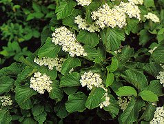 ガマズミ (スイカズラ科) 山地にみられる落葉低木。全体に粗毛あり、 葉身は広い倒卵形。小白花のかたまりは 1対の葉の間から短枝を出して頂生する。 果実ははじめは鮮紅色で終りには暗赤色となる。 甘ずっぱいので子供はよく食べた。 日本名はガマズミのスミは染の転じたもので、 ミヤマガマズミの果実は衣服を染めるのに 使ったのと関係がある。また神ッ実で、桃の 渡来の説話に関係あるともいわれる。