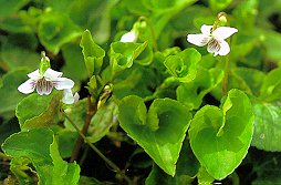 アギスミレ (スミレ科) 湿地や渓流のほとりにはえる多年草。 花後、茎がのびてはいずり回る。 葉は三日月型になる。 ツボスミレの1つの型である。 日本名はあごスミレで、葉の基部の両側が 耳状にはり出したのを、あごにたとえたもの。
