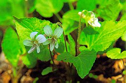ヒカゲスミレ (スミレ科) 山の日かげにはえる無茎性の多年草。 白色の根から新苗をつくり群生する特徴がある。 葉の両面には軟毛が多く、質がうすく、軟らかく 見える。花は白色、距は6〜9mm、同筒形で 長くて太い。がくの付属体はふつう歯があり 毛が並んでいる。 日本名、日陰スミレ。