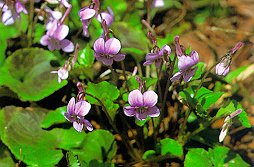 ナガハシスミレ (スミレ科) 木かげにはえる多年草。 タチツボスミレとよく似ていて、葉は円形で 長さも幅も2〜4cmでほとんど同じ。 花は根もとからと、茎の上から出るものがあって 淡紫色。距がななめ上を向き、長さ10〜18mmと 長いのが特徴である。 日本名長嘴スミレは、距の長いのをくちばしに 見たてたもの。 別名は天狗スミレで、天狗の鼻に見たてたもの。