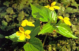 オオバキスミレ (スミレ科) 山地の日陰で湿ったところにはえる多年草。 茎は高さ10〜30cm、全体が軟らかい 感じのする大形のスミレ。葉面にはつやがあり、 葉脈がくぼんでいるのがはっきりしている。 葉は花後別種と思われるほどのび、 長さが10cmほどになることがある。 距は非常に短い。 日本名大葉黄菫。