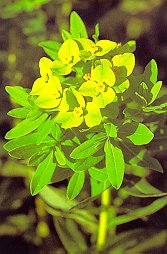 ノウルシ (トウダイグサ科) 湿原にはえる多年草で群落をつくる。 茎は高さ40〜60cm、春に上部の葉が 黄色になり、その葉の間に多数の小さな さかずき状の花ができる。その中に多数の 雄しべと雌しべが伸び出している。 さかずき形のへりにはじんぞう形の腺体が つき蜜を分泌する。雌しべは受粉すると 下向きになって果実になる。果実は 3稜のある球形でいぼがある。日本名は 野漆で、切るとウルシに似た白乳液が出るから。