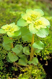 ネコノメソウ (ユキノシタ科) 水辺にはえる小形の多年草、しばしば 群落をつくる。茎は高さ5〜20cmとなって 花をつけるものと、はって節から根を 出すものがある。全体無毛で、葉は対生し、 花のまわりの葉(包葉)は黄色に変わり、 花は小さく花弁はない。がく片4、雄しべ4本、 黄色のやくをもつ。果実は、深く2つに 裂けたのが猫の目に似るので、日本名を 猫の目草という。