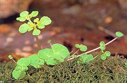 チシマネコノメ (ユキノシタ科) 谷間の湿地にはえる軟弱な多年草。 根出葉はロゼット葉で、花後にも残る。 花茎は高さ2〜20cm、淡緑色か紅色をおびる。 1対の茎葉は対生する。包葉はやや扇形、花は 淡黄緑色、雄しべは8本、種子には数条の 肋がある。花後、走出枝がのびて先に ロゼット葉をつける。日本名は千島猫の目で、 千島にあるネコノメの意。