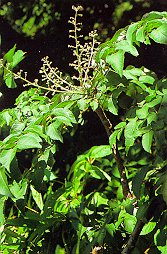 タラノキ (ウコギ科) 山野に普通な落葉低木。幹の高さ2〜7m、 あまり分枝しない。新しい幹にはとげが多い。 丈夫な木で、山火や伐採跡地では地表下を横走する 根が次々と苗を出して群生するという。 若芽は山菜として人気が高いので、芽がもぎ取られ 素直に育っている木はほとんどない。 人間のため一番被害を受けている木はこの木だろう。 タランボの木はいう、「1芽だけでも残してくれ」と。