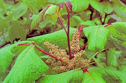 ツタウルシ (ウルシ科) 山中にはえるつる性の落葉木。気根 (空中にのびた根)を出して他物の上をはう。 葉は3出複葉で中央の小葉がもっとも大きい。 新しい枝の葉腋から花の房を出す。雌雄異株で、 雄花は房が6〜7cm(写真)と長く、5本の 雄しべがあり、雌花は房が短く、1子房と 小さい5本の雄しべからなる。新葉は赤いが、 秋にもまた紅葉する。ウルシと同様体質に よってはかぶれるので注意を要する。