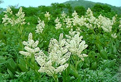 コバイケイ (ユリ科) 長万部町栗岡のもと中学校あとから 栗岡にかけて、国道沿いの原野には、 いろいろな植物群落があって、 けっこう見ごたえがあります。 コバイケイの花の盛りもすばらしい。 =コバイケイソウ