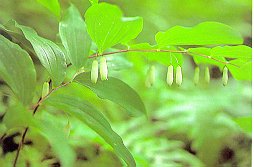 ミヤマナルコユリ (ユリ科) 乾いた丘陵地にはえる多年草。 茎は高さ30〜60cm、細いが強く直立し、 上部が斜上する。茎にはたてのすじがある。 葉腋に硬くて細長い花柄を出し、葉の裏側に かくれるように2つに分かれ、その先に白花をつける。 花筒の内面には細毛があり、雄しべの花糸にも 細毛がある。 日本名深山鳴子百合。花が鳴子状に並んでいるから。 鳴子とは、小さな竹筒を板に並べかけて、引くと音がして 鳥を追いはらう道具。
