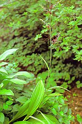 シュロソウ (ユリ科) 林内にはえる多年草。茎は直立し 高さ約60cm、根本に葉鞘(さや状托葉)の 腐った黒褐色のシュロ状の毛がある。 それでこの名がある。 茎頂に花穂を出し、黒紫色の花をつける。 アオヤギソウは形がそっくりだが、 淡緑の花をつけるので、区別できる。